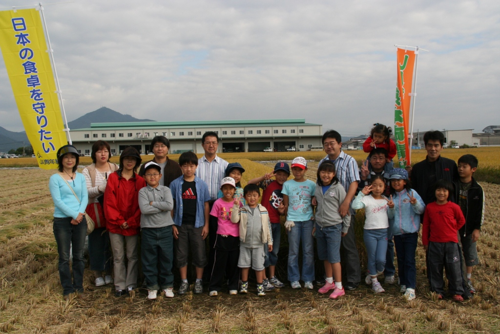 | 稲刈りを体験したスクール生と保護者 |