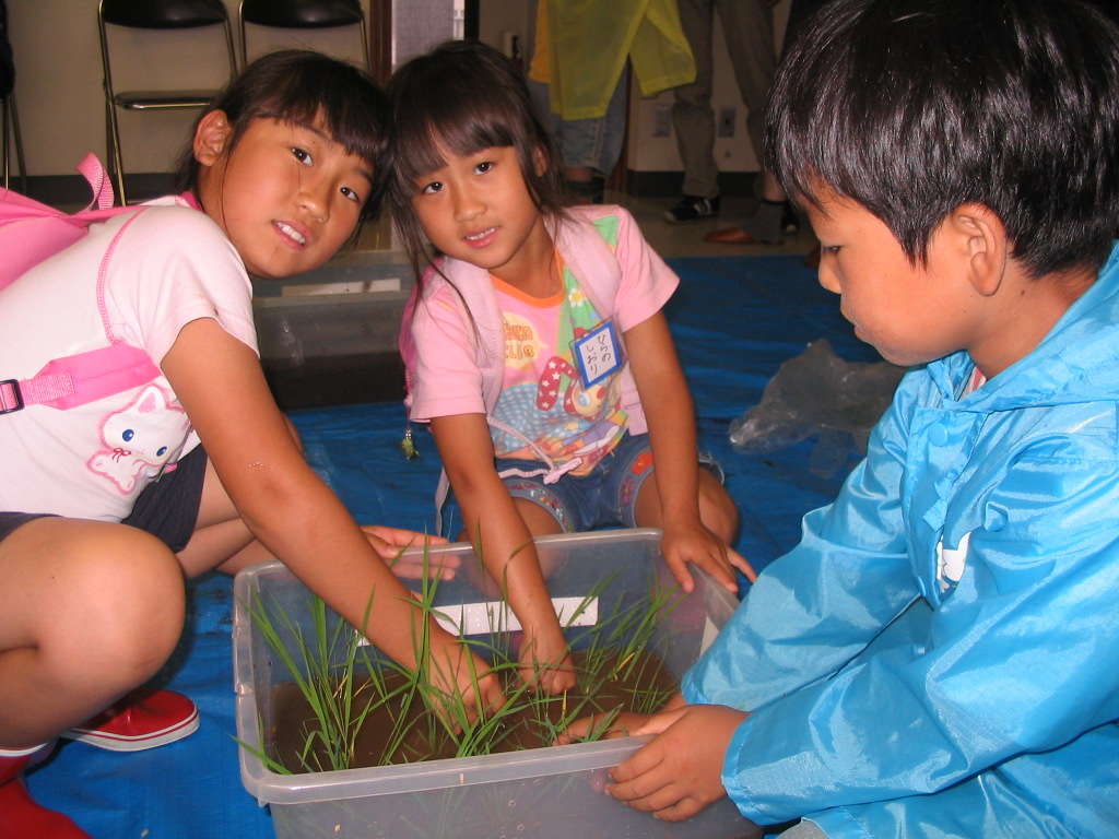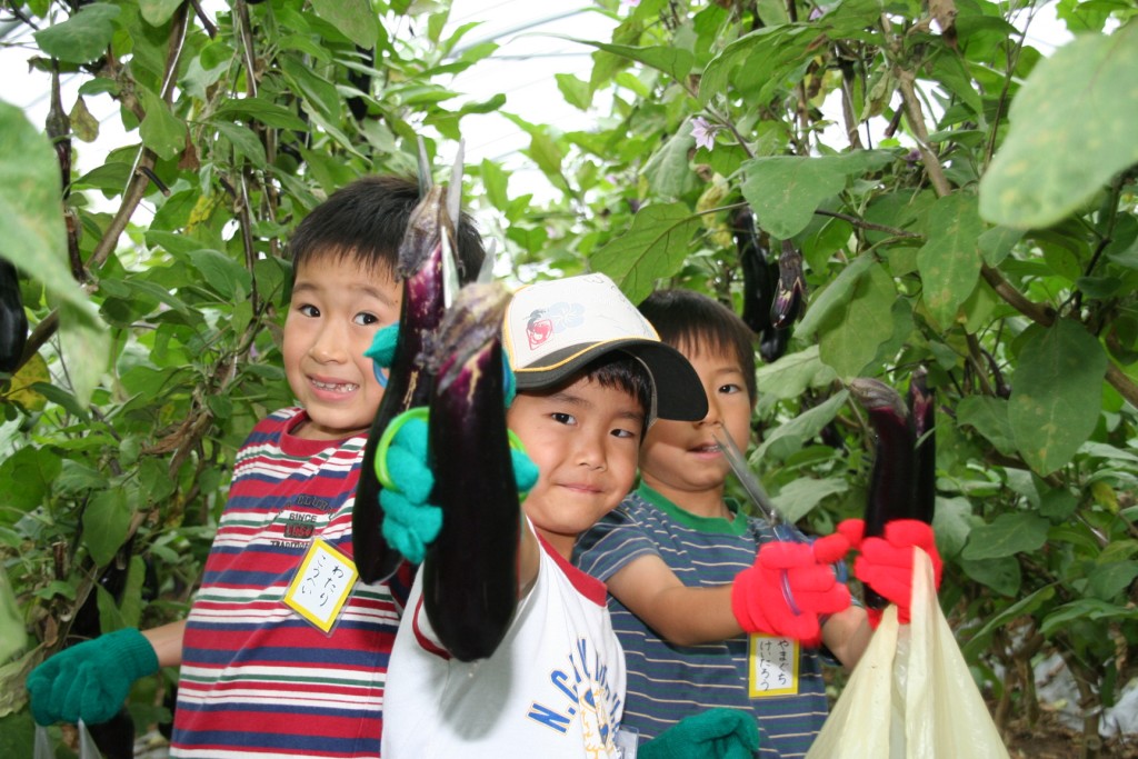 ナスを両手に笑顔の、田迎南小3年の佐藤駿光くんは「ナスは大好き。家に帰ったら天ぷらにして食べたい」と喜んでいました。参加したスクール生の保護者は「田植えが出来なくて残念だったけど、思わぬナスの収穫にこどもたちも大喜びで良かった」と話していました。