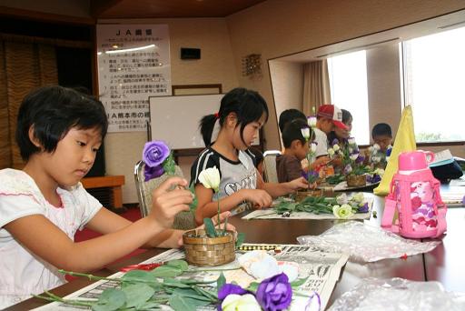 JA熊本市は9月20日、あぐりキッズスクールの児童44人が参加し、フラワーアレンジや巻寿司作りなどの食育活動を本店で開きました。