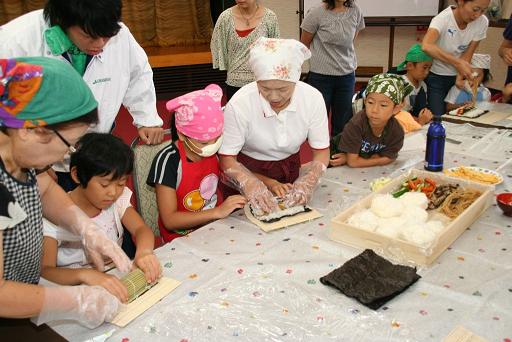 | 女性部の方々に教わり巻寿司作り |