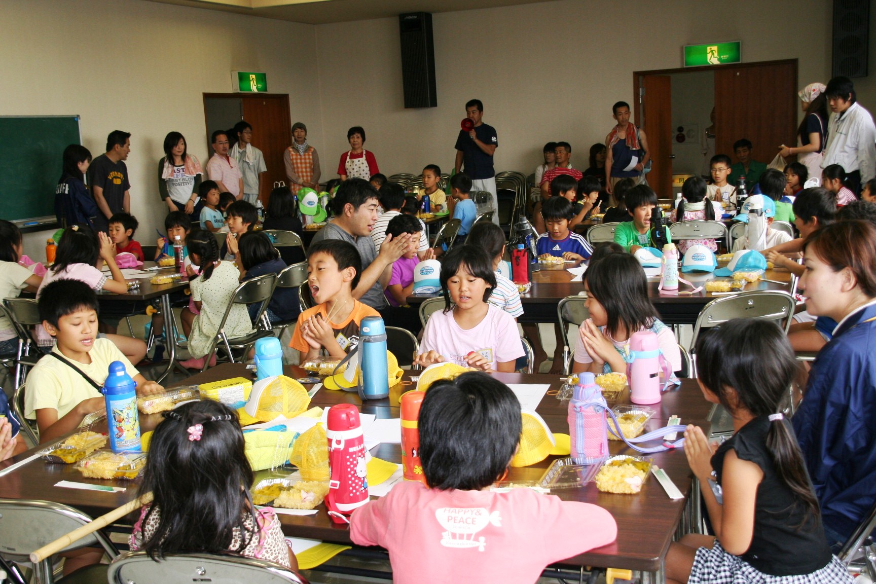 昼食は、JA女性部員ら手作りのレイシやナスなどが入った郷土料理「こねり」とミカン果汁で炊き上げたごはんを味わいました。