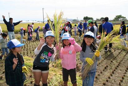 スクール生らは同市会富町の田んぼ約10㌃で、JA青壮年部や職員らの指導を受けながら作業。こうべを垂れ黄金色に実った稲を、かまを使って1株ずつ丁寧に刈り取りました。初めて稲刈りをした市立碩台小3年の千羽叶芽さんは「(稲穂に)お米がたくさん付いていてすごい」と話していました。