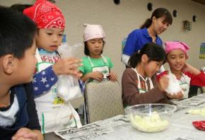 調理実習ではJA女性部員らと一緒に「フライドナス」作りに挑戦。事前に女性部員らにスティック状に切ってもらったナスを、スクール生らは米粉と片栗粉を合わせた粉にまぶし塩などで味を調えました。