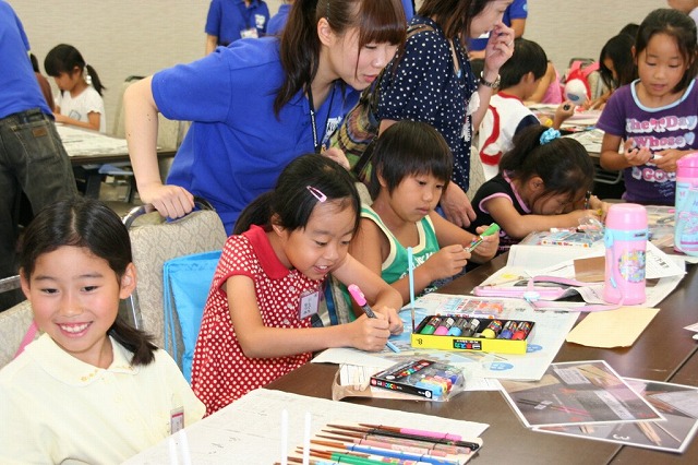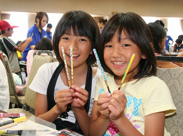 スクール生らは箸についてDVDを観て学んだ後、自分の手に合った箸の長さを計測シートで確認。専用のノコギリでカットし、切った部分を紙やすりで磨いて製作した。箸先の本うるしの上の部分をカラーペンでデザインし、約2時間の作業でオリジナルのマイ箸が完成。田迎小6年の竹崎綾夏さんと同4年の朋夏さん姉妹は「色使いに迷ったけどカラフルにできた。大切に使いたい」と満足げでした。製作したマイ箸は同研究所主催のコンテストにも出展予定。子どもたちには、色落ちしないようにコーティングを施してから9月の同スクールで配布します。