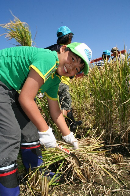 同市南区会富町のあぐりキッズ農園で育ったサツマイモを収穫。スクール生らはJA青壮年部員らにスコップで土を掘り起こしてもらうと、埋まっているサツマイモを夢中で掘り当てました。稲刈りでは職員から稲刈りの指導を受けると、鋸鎌(のこがま)を使い刈り取り。コンバインが脱穀する様子を見学しました。