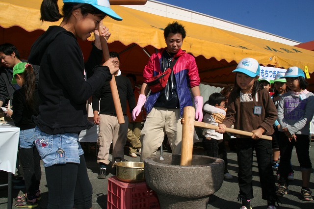 スクール生らは「取れたての新鮮な野菜はいかがですかー」と元気よく来場者にPRし、野菜が売れると大喜び。JA青壮年部のもちつき実演販売に参加し、自分でついたもちを美味しいそうに食べていました。