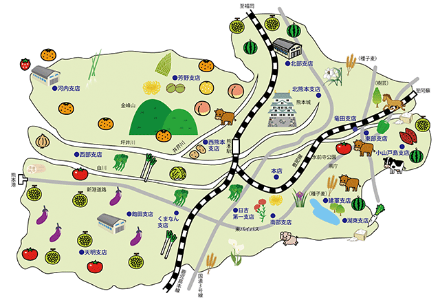 JA 熊本市は、熊本市(北区植木町、南区富合町・城南町を除く)を管轄に営業しています 管内の農業は、北西部の金峰山麓を中心とした果樹地帯、北東部はスイカ・メロン・肥育牛・酪農などを主体とする洪積台地地帯、南西部は米、ナス、メロン、さらに都市中心部には花卉・野菜などを生産する平坦水田地帯から構成されています。 特に、金峰山麓を中心としたみかん、天明・北部・供合などで生産されるスイカ・メロン、飽田・天明地区のナス、中島のレンコン御幸のカラー、田迎のバラ・菊などは県下ならびに全国でも有数の生産を誇り、小山戸島の乳牛なども加え、ほとんどの農畜産物を生産する食糧基地としての使命を果たしています。 |