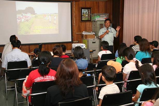 JA熊本市東部支店では、大津社長が講師になり、スクリーン(パワーポイント)を使って講話。地元の小学生を対象に、大豆の種まきから収穫、加工まで体験を通じた食育や納豆に加工して同市の学校給食で食べてもらうための取り組みなどを紹介しました。