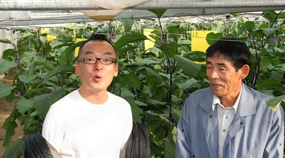 熊本市護藤町のナスのハウスで11月4日、熊本県民テレビの番組「テレビタミン」の生放送があり、収穫期を迎えた旬の味覚としてナスが紹介されました。ナスはJA熊本市茄子部会が生産する「肥後のでこなす」で、部会長の後藤義明さん(60)のハウスにリポーターが訪れました。