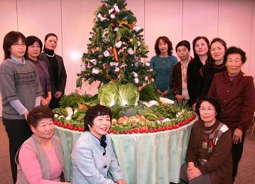 手作りの野菜ツリー点灯式で幕開けした収穫祭は、会員3人が農作業風景などを会場のスクリーンに映し出し、説明を加えながら活動報告。