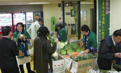 熊本市とJA熊本市は12月28日、同市手取本町の熊本市役所本庁舎内で「地産地消フェスタ」新鮮・農産物販売キャンペーンを開きました。昨年に続き2回目で、JA熊本市女性部と熊本市農業元気づくり対策協議会が協力しました。