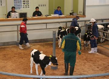 初競りにはホルスタインや交雑種、黒毛和種など120頭が上場。競りが始まる前には、詰め掛けた購買者らが市場内に繋留された家畜の成育状態やケガの有無、毛づやなどを入念に見定めていました。競り人の威勢の良い掛け声が場内に響き渡ると、子牛全頭が次々に競り落とされました。