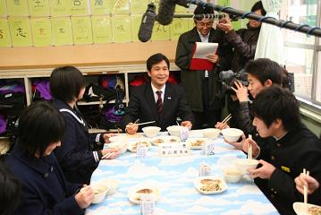 熊本市は1月15日、第1回学校給食「ひご野菜の日」交流会を同市出仲間の市立託麻中学校で開き、幸山政史市長らと生徒が会食して交流しました。