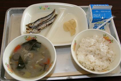 | 献立:根菜のみそ汁・麦ごはん・めざし・たくあん・牛乳 |