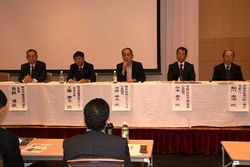 続いて同技術センター研究員や企業の代表ら5人をパネリストに「逆境の中から農商工連携への取り組み」をテーマに討論。JAの鳥飼博秋参事が農業者と商工業者相互間のコミュニケーション不足などの課題を提起。業務用アイスの製造販売を行う㈱パストラルの市原幸夫氏は「農業を起点とした生産・加工・販売を基に、交流を通して農村の再生に取り組んでいる」、家業の農業から㈲中原温室 を立ち上げ販売出荷まで手掛けている作本泰生氏は「魅力ある楽しい農業の実現には、資源を活かすための仕組み作りが重要」、㈲氷川町まちづくり振興会の鮎川高明氏は「物産館での地域特産品の加工販売を通じ、異業種間のコミュニケーションを大切にしている」などの意見が出ました。