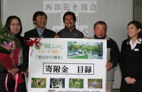 この日は、熊本市が平成21年度から実施している市街地に緑を創出する「市電緑のじゅうたん事業」サポーター制度に伴う贈呈式を同JA中島支店で開催。部会員や行政、JA関係者ら15人が参加し、生産者の村上秀年さん(62)が生産するアリウムの花束と寄付金(3万円)の目録(写真)を市の担当者に手渡しました。