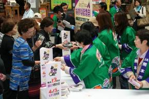 買い物客らでにぎわう繁華街の会場では、3本入りのナス300袋と同部会女性部が考案したナス料理レシピを午後4時17分(ヨイナス)から一斉に無料配布。足を止めた通行人らは、長い列の最後尾に並んでいました。また、ナスの栽培圃場や同JA野菜選果施設などを紹介するパネルも展示され、関心を集めました。