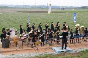 地域ぐるみで行う祭りは、園児による太鼓や秋津公民館オカリナ講座のオカリナ演奏のほか、秋津小と東野・桜木両中学校吹奏楽部が演奏を披露。れんげ広場では秋津ふるさと会の指導で、子どもたちがレンゲの花で首飾りや冠を作って昔あそびを楽しみました。親子連れらは会場に響き渡る音楽と、辺り一面に咲き誇るレンゲを満喫していました。