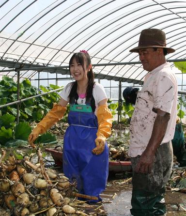 ビニールハウスで促成栽培する新レンコンの産地を、タレントの緒方仁深さんがリポーターとなり訪問。水かさが膝の辺りまであるハウス内では、右田部会長が掘り機の水圧を利用し浮き上がるレンコンを収穫。「レンコンは根と思われがちだが本当は茎。品質保持のため、節がつながったレンコンの先端部分の芽も一緒に収穫するのがポイント」と説明しPR。
