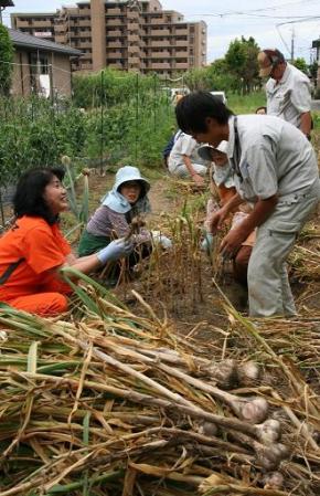 女性部員らは同センター職員らと一緒に作業。地表から約80センチ伸びたニンニクの茎を握り締め、1株ずつ手作業で収穫しました。1片の種は直径約5センチの球根《8〜10片》に生長し、4つの畝《幅0・8メートル・長さ15メートル》からコンテナ《縦60センチ・横40センチ・高さ25センチ》に4杯分のニンニクを収穫しました。
