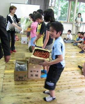 女性の会の豊田スイ子会長(65)が「私たちが愛情を込めて作った地元の安全・安心な農産物です。たくさん食べて」と子どもたちに手渡しました。訪れた会員ら7人は、農業の楽しさや喜びなど農家の気持ちを子どもたちに紹介。大津隆満協議会会長(62)が「大豆の種まきを一緒にやろう。秋には収穫し、豆腐や納豆を作ろう」と子どもたちに提案すると、子供たちは手を挙げ大喜び。