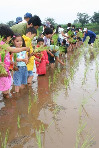 熊本市沼山津で7月4日、「あ・さ・ひ・ば」田んぼの学校が開かれ、地域の子どもたちと保護者約200人が田植えを体験しました。