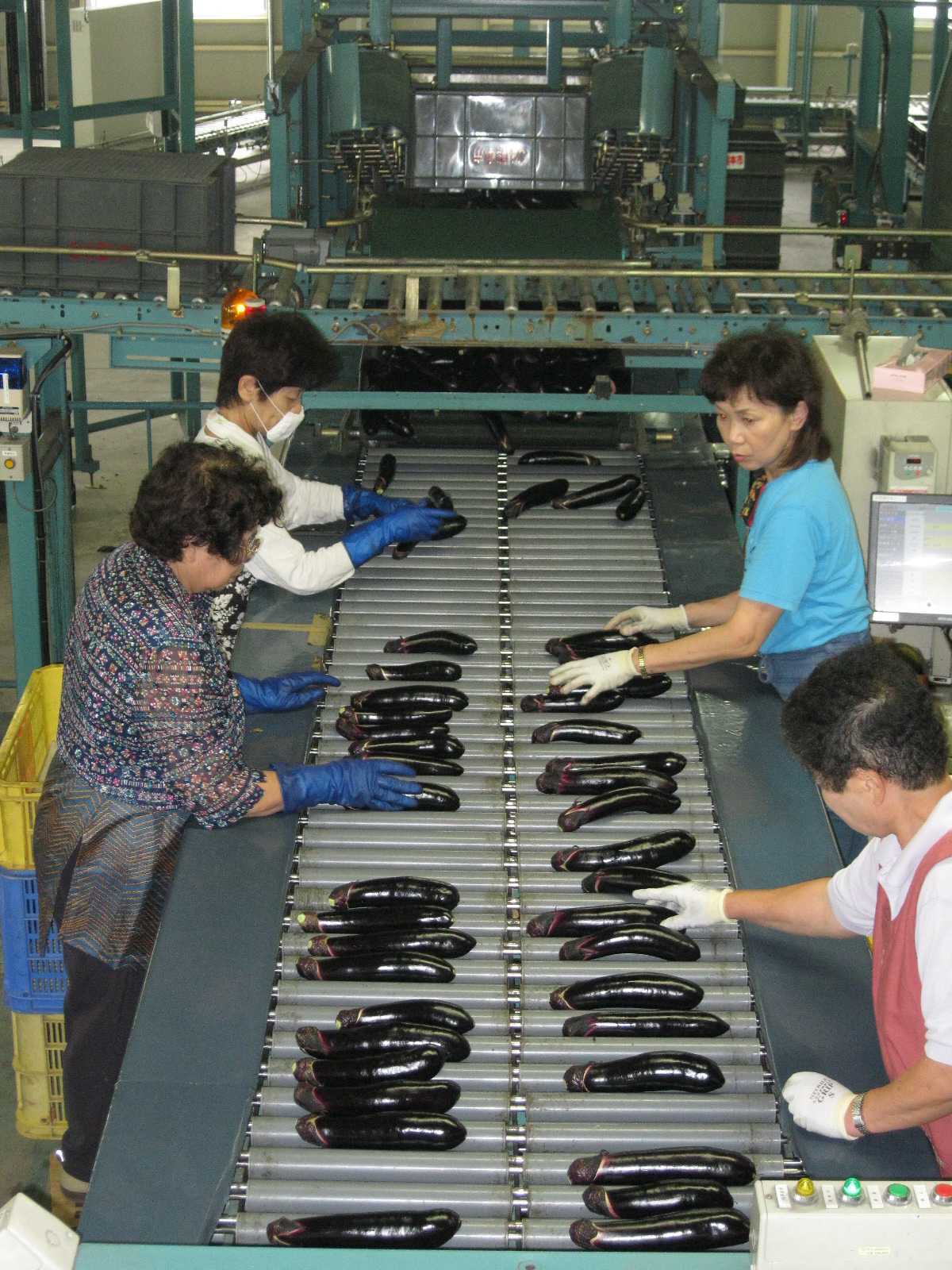 熊本市会富町のJA熊本市野菜選果施設で9月20日、同市西南部で生産が盛んなナス「肥後のでこなす」の出荷が始まりました。昨年度より5日早い初日は約6トンのナスを選果。長さ20〜24センチ程度のL・2Lサイズを中心に1500ケース《1ケース4キロ》を中京や中国、九州などに向け出荷しました。