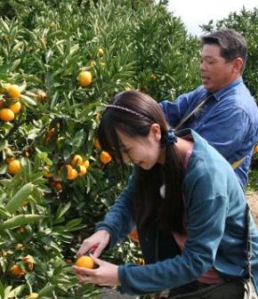 極早生ミカンの出荷が本格化したミカン園に、タレントの緒方仁深さんがリポーターとなり訪問。園地では、坂口さんが丹精して育てたミカンの収穫に大忙し。地面をマルチシートで被覆しミカンの糖度を高める生産技術や、消費地での販促活動など同部会の取り組みを紹介し、JAブランドとして全国に出荷する「夢未来みかん」をPRしました。
