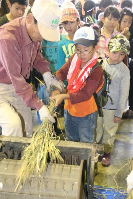 米作りの体験学習を地域一体で行う「『あ・さ・ひ・ば』田んぼの学校」が10月24日、熊本市沼山津で開かれ、小学生と父母ら約200人が稲刈りと脱穀作業を体験しました。地元校区(秋津・桜木)PTAや秋津地域資源保全隊、水土里ネット秋津飯野、JA熊本市などでつくる実行委員会が平成19年から毎年行っています。