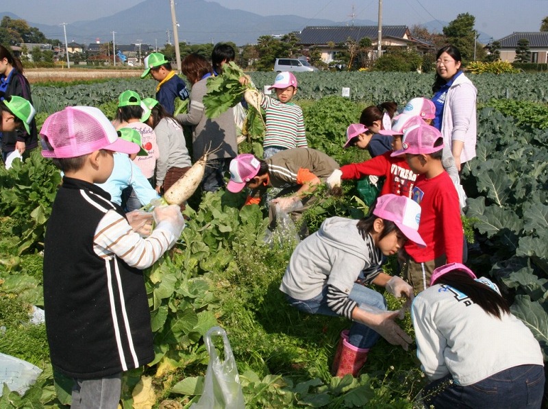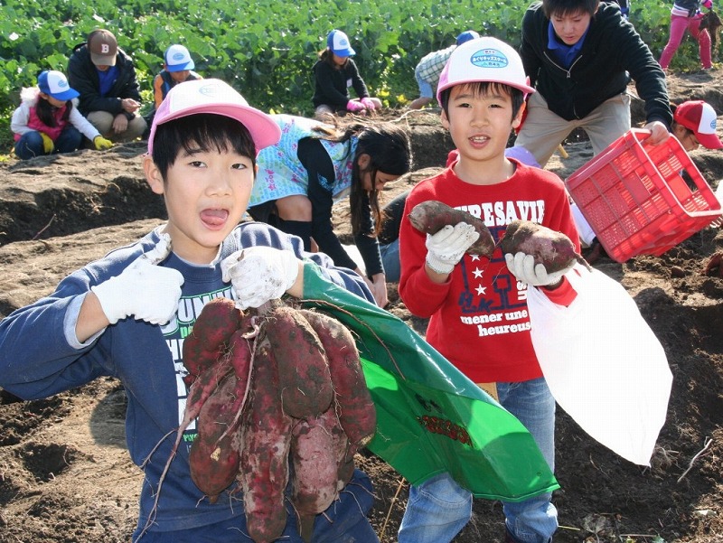 JA熊本市あぐりキッズスクールの児童45人が11月20日、同市会富町のあぐりキッズ農園で育てた野菜を収穫しました。スクール生らは5月下旬以降、苗の植え付けや種まき、みそ造りなどJA青壮年部や女性部の協力により5回の作業を体験。この日は大きく育ったカライモやミニダイコン、ミニニンジンなどを収穫し喜びを実感しました。