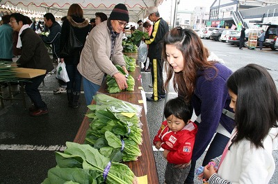 恒例の即売会では生産者が消費者に直接応対。食味や保存法など顧客の質問に答えながら販売し、採れたての農産物は飛ぶように売れていました。初めて訪れた同市城山半田の主婦、桜田麻梨さん(26)は「どの農産物も安くて新鮮。作った人と話ができ安心感がある」と話していました。