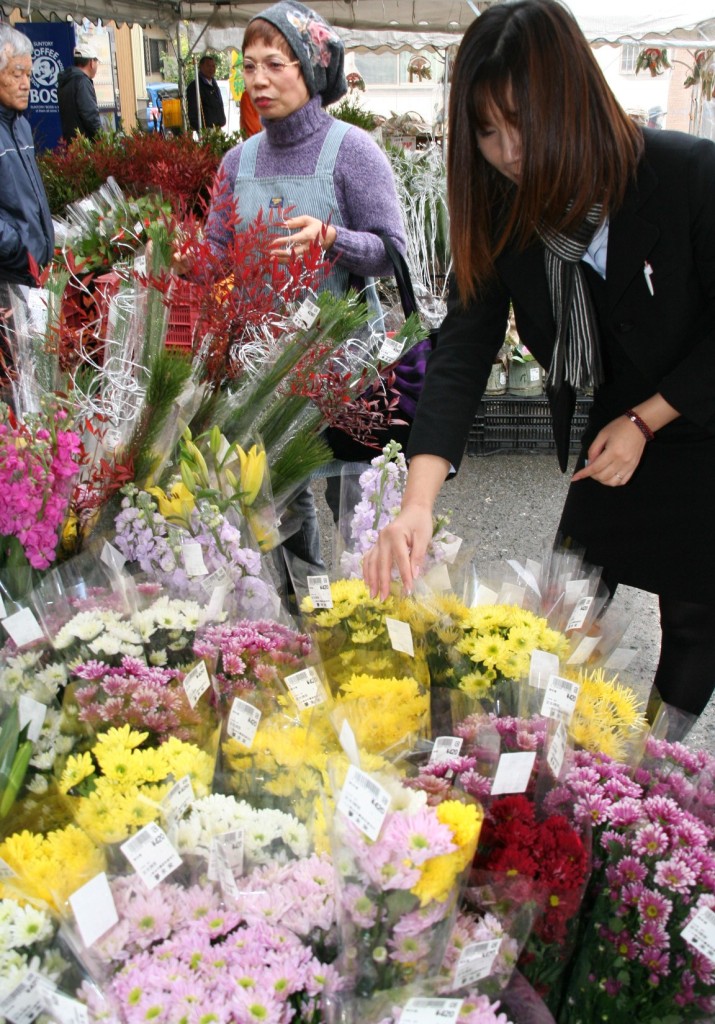 | 正月用生け花などを買い求める消費者(28日、熊本市で) |