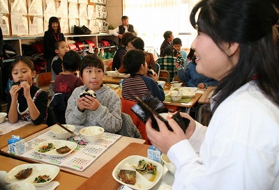 訪れた女性部員らは3年生3クラスに分かれ、サトイモのみそ汁などを歓談しながら会食しました。2組の教室ではプロジェクターを使い、北口和皇JA女性部長がみそ造りの工程を説明。「みそは皆さんにおいしく食べてもらいたいという思いを込めて作っています。安全・安心なみそをたくさん食べて毎日元気にがんばってください」と呼びかけました。みそ汁は大好きという中内柊希(しゅうき)君(9)は「一番好きなのは豆腐と油揚げが入ったみそ汁」とにっこり。