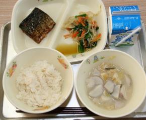 | 献立は麦ごはん、さといものみそ汁、さばのしょうが煮、ほうれんそうのごまあえ、牛乳 |