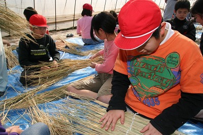 子どもたちは大津隆満社長(63)らの指導を受けながら作業。ひもと約50センチの棒を使い、無農薬の稲わら3本ずつを根元と穂先の向きを交互に変えて編み込んでいく作業に取り組みました。初めて体験した大久保千紘君(10)は「わらにすきまが出来ないよう、ひもを真っ直ぐに結んでいくのが難しかった」と話していました。