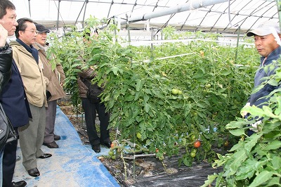 県内の和・洋食、中華の総料理長や卸・小売など食品流通関係者らは、管内の圃場(ほじょう)とJA野菜選果施設(同市会富町)を視察。施設栽培のナス、トマト、メロンと茎ブロッコリー「スティックセニョール」の畑では、エコファーマーの栽培技術や農作物の生産期間などを生産者とJA営農指導員が説明しました。