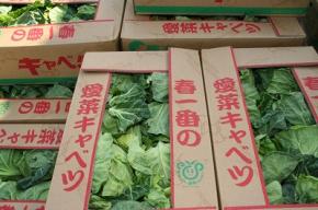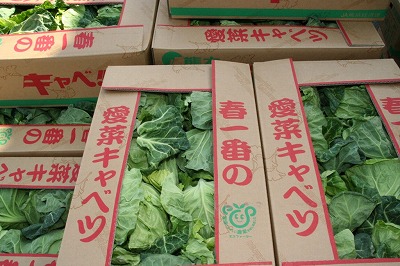 部会長の礒野強奇さんは「新鮮さや安全はもとより、消費者においしいキャベツをきれいな状態で食べてもらいたい」と話します。「春一番の愛菜キャベツ」と記された厚手の出荷箱は防水加工を施し、品質や鮮度保持を徹底しています。JAでは主に中国地方を中心に福岡や地元市場にも出荷。4月下旬に出荷のピークを迎え、5月下旬まで1100トンの出荷量を計画します。 |