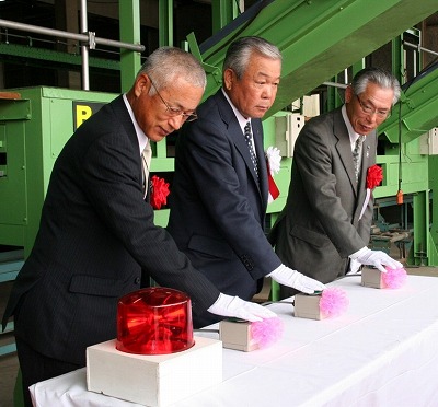 | JAの村上組合長(中央)と今井厚雄園芸部会長(左)らによる選果ライン始動式 |