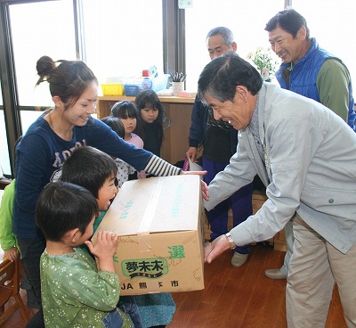 JA熊本市茄子部会は4月14日、長ナス「筑陽」の生産地である同市の飽田・天明・西部地区の保育園など17カ所に、ブランドの「肥後のでこなす」8㌔ずつを贈りました。地域の人たちに農家が丹精して育てたナスを食べてもらおうと、4月17日(ヨイナス)の「なすび記念日」に合わせて毎年行っており、保育園への配布は昨年に続き2回目。