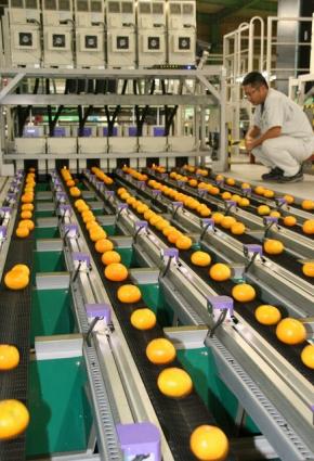 | 品質や着色、生傷などを新型センサーでチェックされる早生温州ミカン |