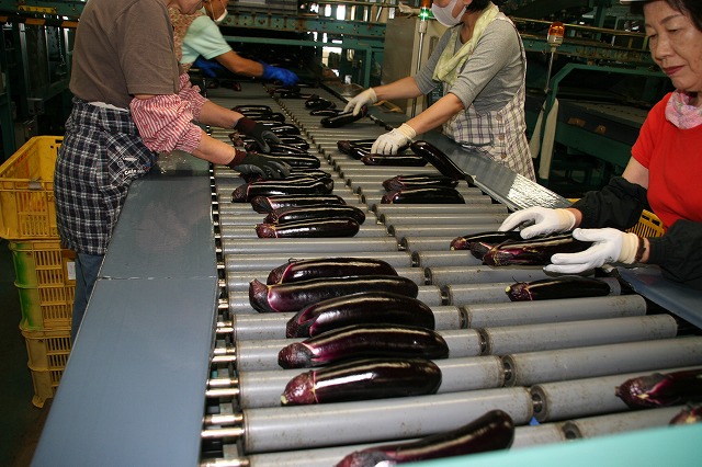 熊本市南区会富町のJA熊本市野菜選果施設で9月19日、同市西南部で生産が盛んなナス「肥後のでこなす」の選果が始まりました。初日は約7トンを選果し、長さ24センチ程の2Lサイズを中心に1600ケース(1ケース4キロ)を中京や関西などの市場に出荷しました。