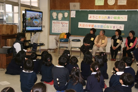 この日、1年間の食農教育活動のお礼に地域住民らを招き、同小学校で学習発表会と給食会を開催。3年生はスライドショーで大豆栽培や味噌作りや豆腐作りを振り返りました。5年生は、1年間育て収穫した米について様々な視点から調べたことを発表。作物の栽培指導や、圃場の提供、加工食品の作り方などは保全組織が行っています。