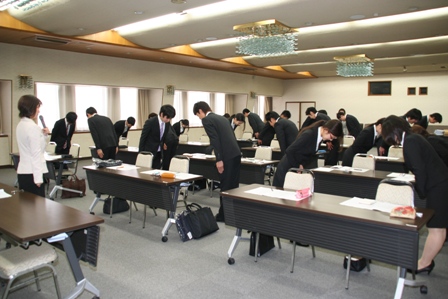JA熊本市は3月28日、平成25年度新規採用職員の接遇研修会を本店で開き、採用内定者24人(男性17人・女性7人)が実践研修に臨みました。社会人としての心得を身に付けてもらおうと毎年入組前に行っています。