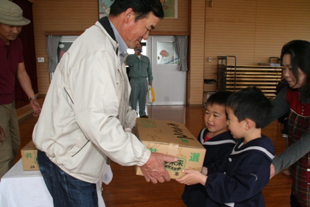 部会の役員ら6人が3班に分かれて訪問。同市飽田地区の藤富保育園では、中原克義副部会長(63)が「栄養たっぷりのナスです。たくさん食べてね」と園児に手渡しました。ナスを手にした子どもたちは「ありがとうございます」と喜んでいました。