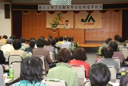 JA熊本市女性部は4月16日、第22回通常総会をJA本店で開き、女性部幹部やJA関係者ら120人が出席しました。平成25年度は、より参加しやすい仲間作り、部員のニーズを反映したJA女性らしい活動を展開し、女性の正組合員加入促進や地区総代登用など目標達成を目指します。