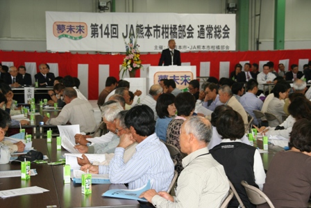 JA熊本市柑橘部会は5月9日、第14回通常総会を同市西区河内町のJA夢未来柑橘選果場で開きました。部会員はじめ全国の指定市場14社、地元議員や行政、JA関係者ら約430人が出席。全国的に表年で生産量の増加が予想される平成25年産ミカンは、高品質生産と計画出荷の継続により「夢未来みかん」ブランドの確立を目指します。