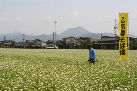 今年は3〜4月の寒の戻りで背が低かったが生育は順調。同地区は有明海に面した海岸沿いの地区で、温暖な気候が春ソバ栽培に適しています。乙畠営農組合が水稲作付け前の休耕田を有効利用し、春ソバ「春のいぶき」を栽培。栽培面積は6㌶で、収量は4000㌔を見込みます。
