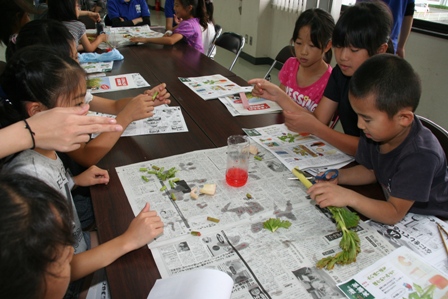 「ちゃぐりん」の時間では、食紅をとかした水を使って植物の水の通り道である道管を観察。昼食はJA熊本市女性部らが用意した手料理で、エーコープマーク商品を使った肉ジャガ、キャベツと塩昆布の和物、おにぎりを味わいました。