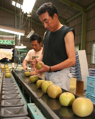 JA熊本市芳野梨選果場で7月23日、トンネル栽培の梨「幸水」の出荷が順調に行われています。約8㌧を出荷する見込みです。同JA芳野ナシ部会の杉本俊一部会長は「2013年産は雨も少なかったため、果実品質、食味ともに良好に仕上がっている」と話します。