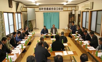 農家の高齢化や後継者不足など地域農業の担い手不足が懸念される中、良町営農組合設立準備委員会は南部支店管内の良町地区で、農作業の受託を柱とした効率的で持続性のある水田農業の展開に向けてきました。組合員、行政、JA関係者ら30人が出席。同委員会の田中義勝会長が「地区内の農家はじめ県・市、JAなど関係機関との協議を重ね、先進地視察等も行い今日に至った」とあいさつ。
